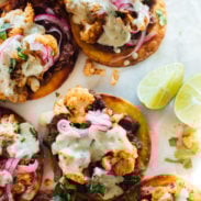 Roasted sweet potatoes topped with creamy chipotle sauce, spicy ground chicken, avocado, cilantro, and pickled onion. My family loves them!