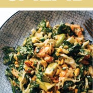Shredded cabbage and kale, shrimp, avocado, cilantro and chili-flavored peanuts, and the perfect sweet miso dressing.