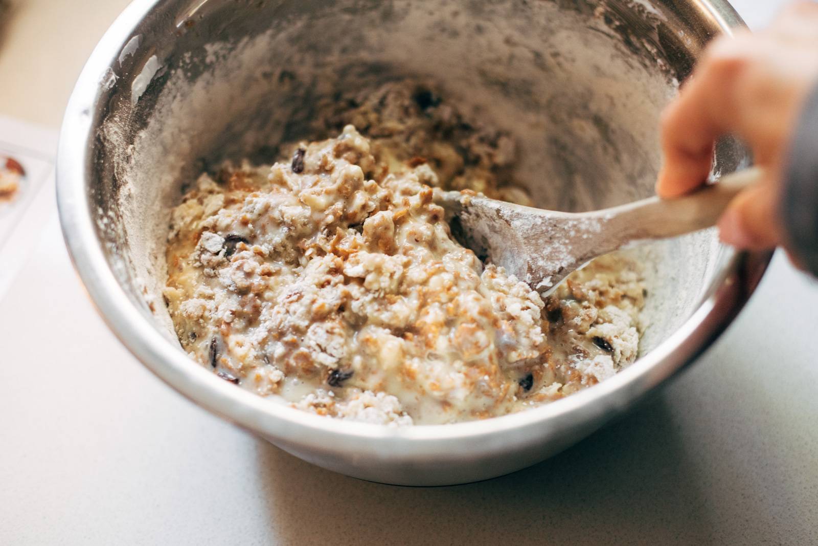 I used cranberry almond cereal (basically sub cranberries for raisins and oat flakes for the bran flakes, throw in some flaked almonds for good measure) that I got from Costco that the kids won’t eat – delish!